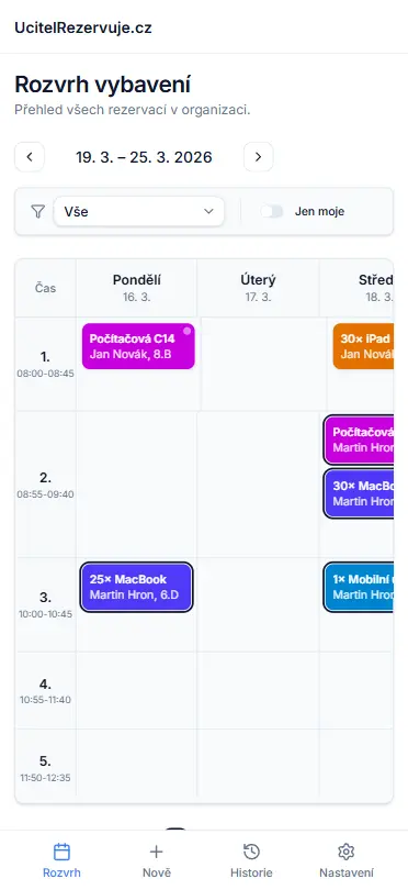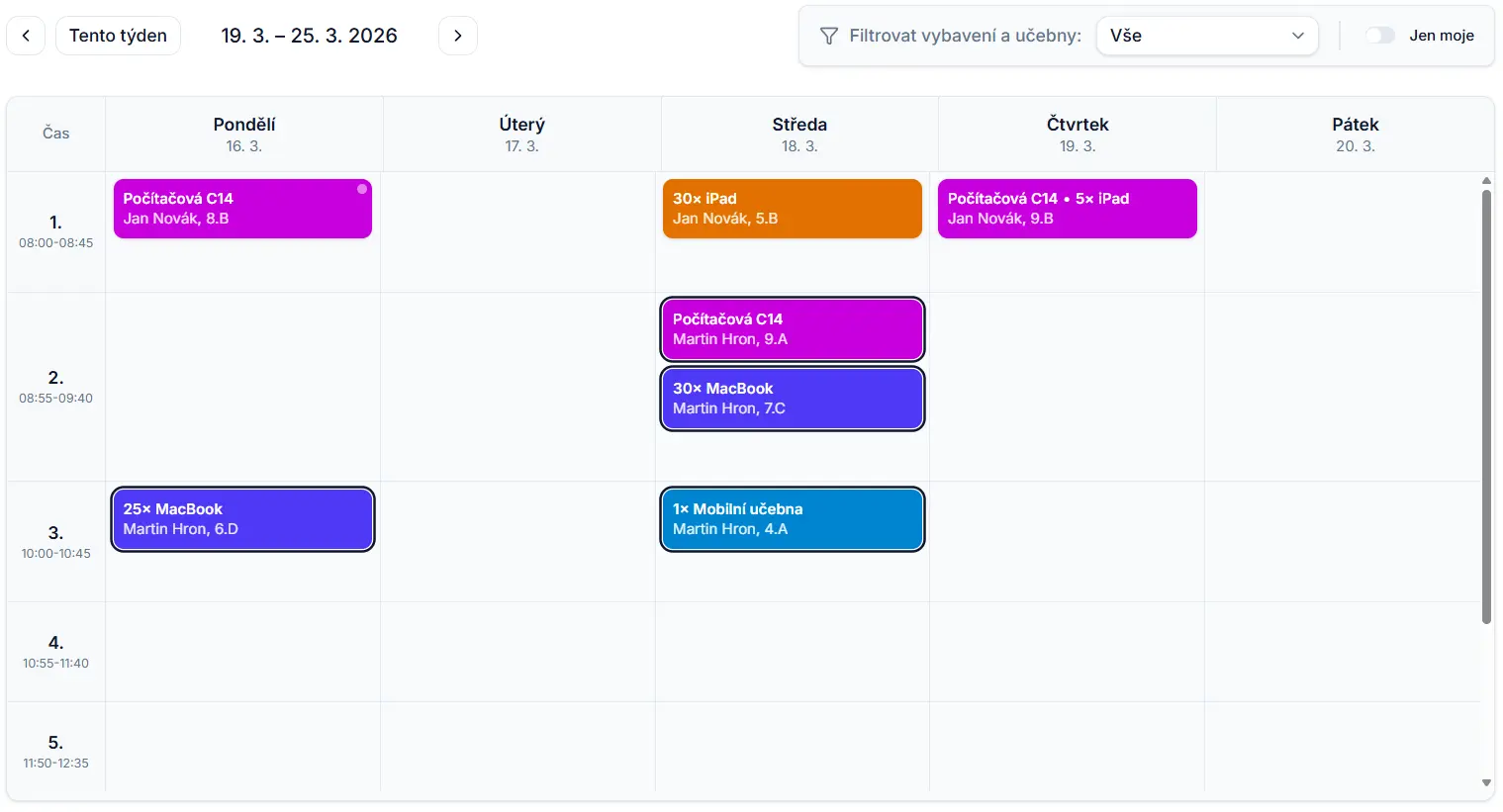 Vidíte obsazenost vybavení po vyučovacích hodinách, podobně jako školní rozvrh. Už žádné konflikty při sdílení vybavení na ZŠ.